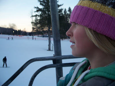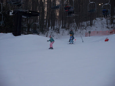 At the end of the night, we managed to get down basic turning and stopping - both very important keys to navigating slopes. Which helps you avoid such things as, oh, I don't know, lift towers. I have a picture of her before she hits a tower. It wasn't too bad - more funny than anything.