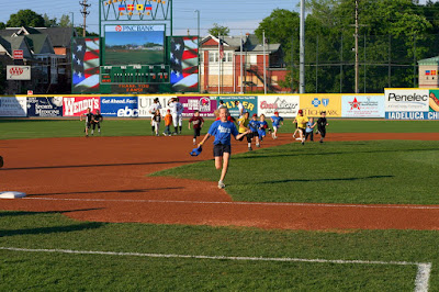 since it was the NELLNight, we were treated to some extracurricular activities, such as the Field of Ginormus Dreams or some other marketing gimmick. basically, the kids from LL will be able to sprint out on the field with the players and stand out there for the opening ceremonies, then they will spring back at the end. abby wanted nothing to do with this, but emma was all about it!